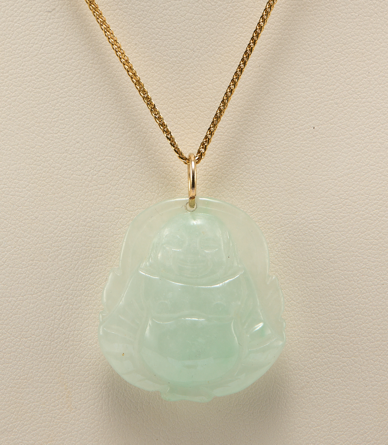 A JADE PENDANT TO A FINE TRACE CHAIN IN 18CT GOLD (2.5GMS), THE PANDANT MEASURING APPROXIMATELY 31 X 30MM, ALONG WITH A CHAIN BRACELET IN 9CT GOLD (1.8GMS)
