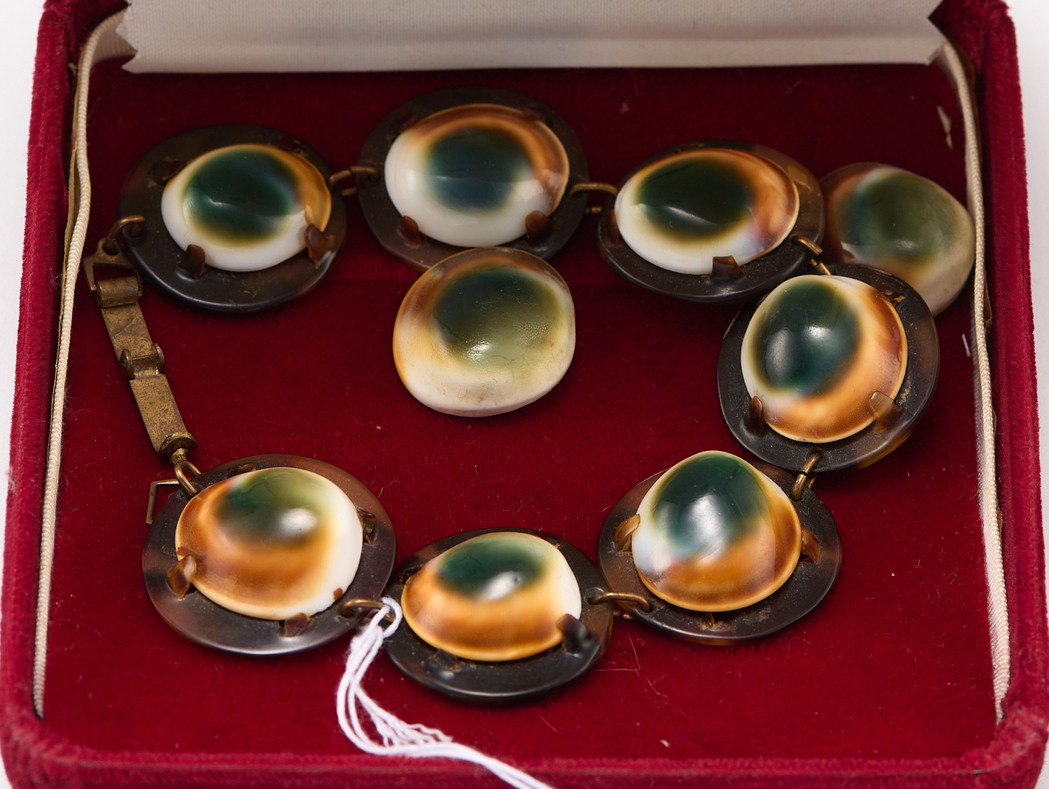 AN OPERCULUM AND TORTOISESHELL BRACELET WITH TWO LOOSE OPERCULUMS, BRACELET WIDTH 22MM, LENGTH 200MM