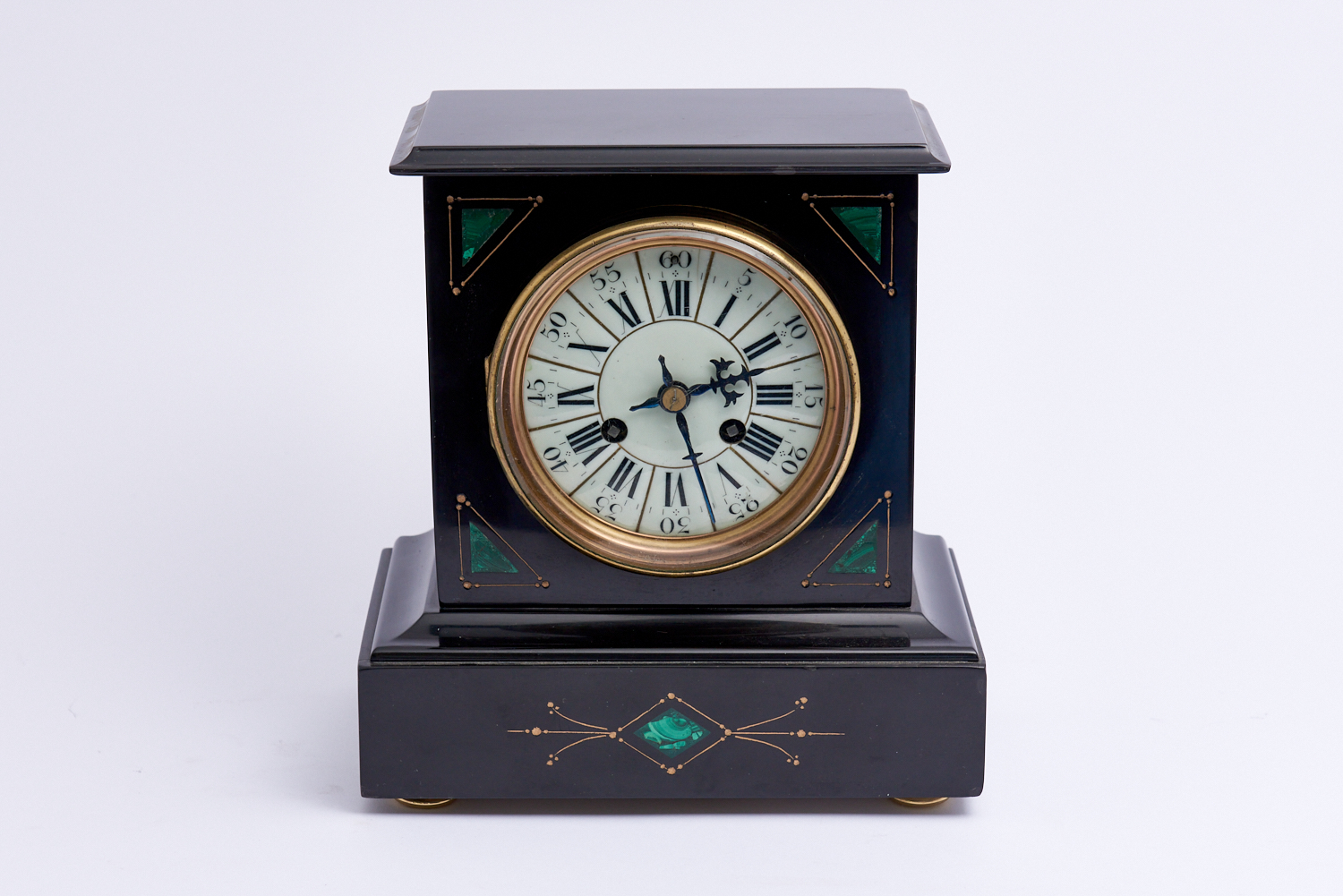 A FRENCH BLACK MARBLE MANTLE CLOCK WITH MALACHITE INCLUSIONS H.24.5CM, LEONARD JOEL LOCAL DELIVERY: MEDIUM
