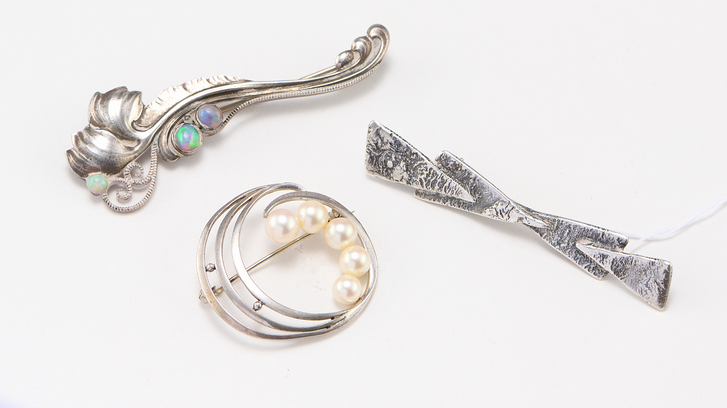 THREE BROOCHES IN STERLING SILVER, ONE OPAL SET (NOT ORIGINAL) BY GEORG JENSEN (72MM X 25MM AT WIDEST), ONE PEARL SET (DIAMETER 37MM) AND ONE BY PETER THONGAARD (69MM X 11MM)