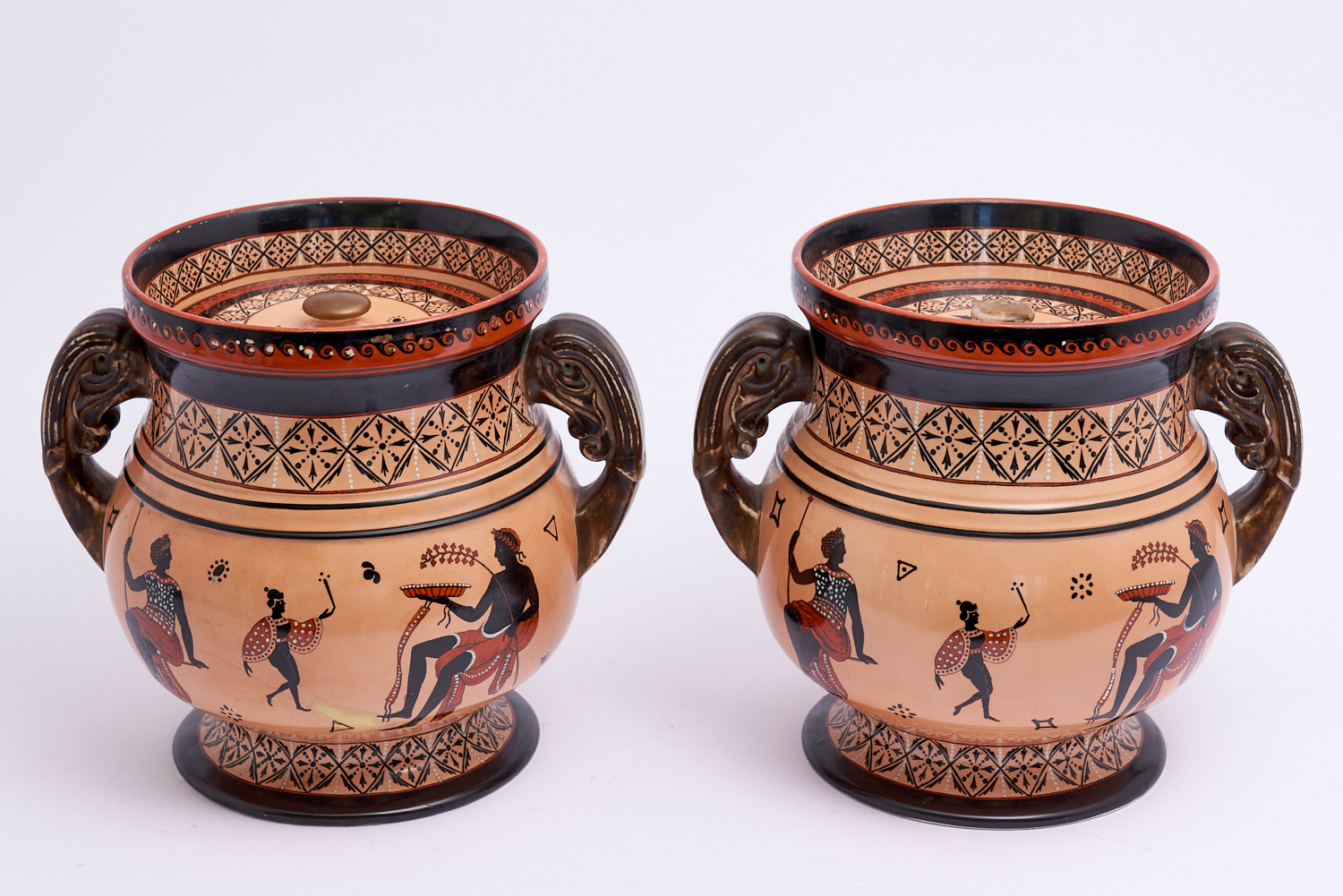 TWO COPELAND LIDDED URNS H.21.5CM (A/F TO ONE), LEONARD JOEL LOCAL DELIVERY: MEDIUM