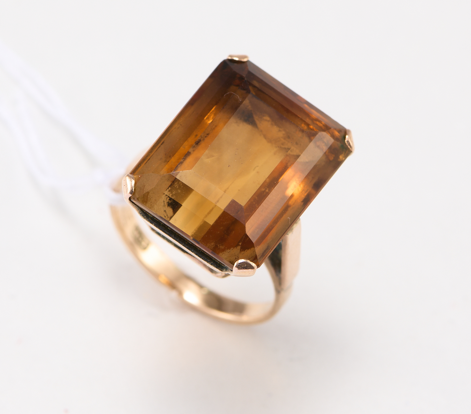 A SMOKEY QUARTZ RING IN 9CT GOLD, THE QUARTZ MEASURING 18MM X 15MM, RING SIZE O, 7.7GMS