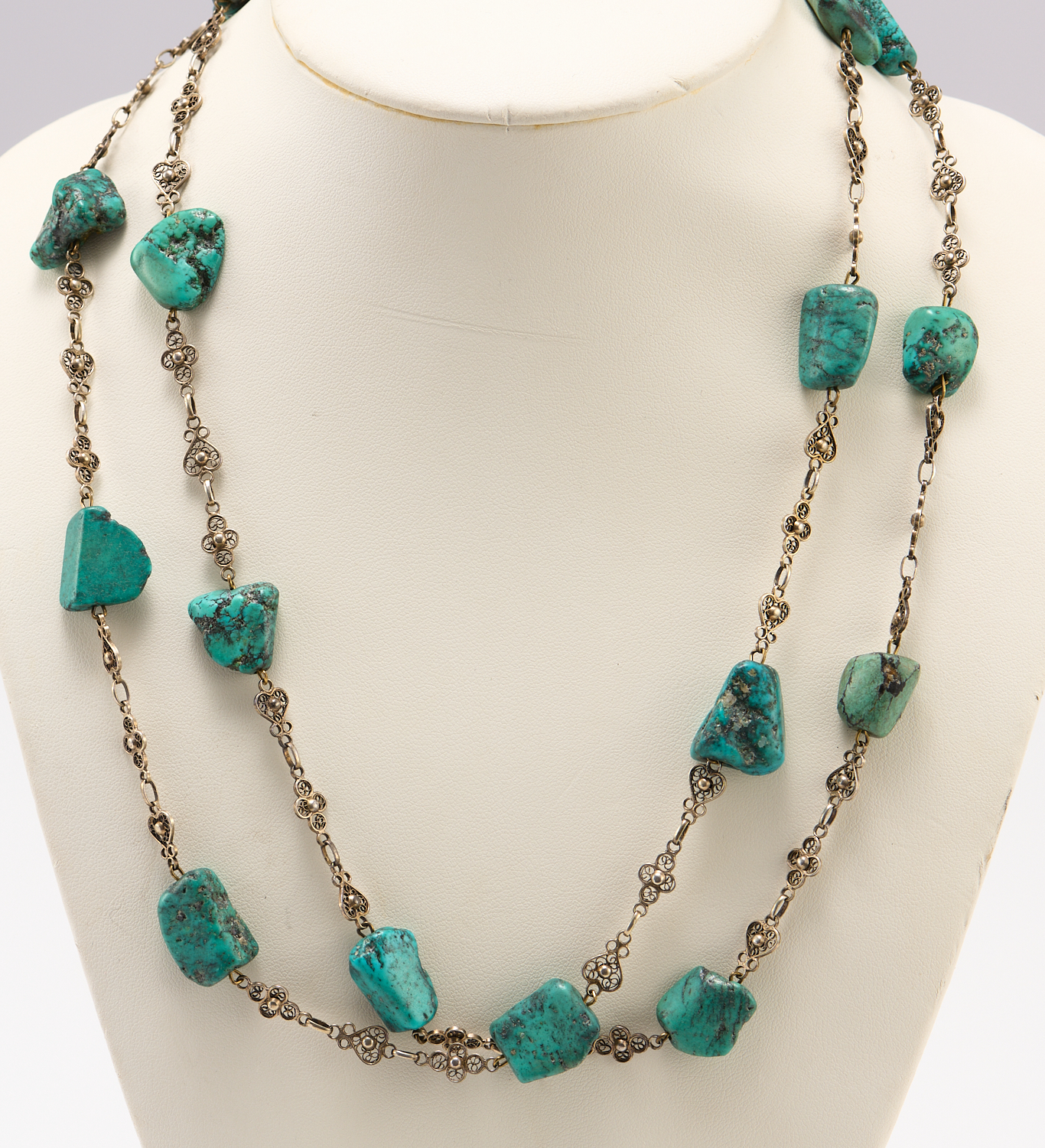 A TURQUOISE AND CONTINENTAL SILVER NECKLACE, LENGTH 1140MM