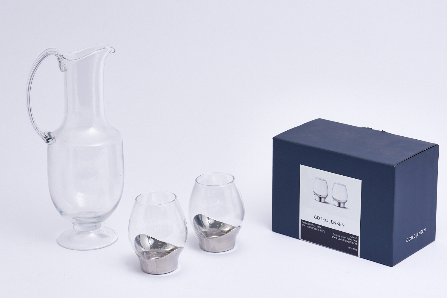 AN ORREFORS JUG BY GUNNAR CYRENA LONG TOGETHER WITH BOXED GEORG JENSEN TEALIGHT HOLDERS, LEONARD JOEL LOCAL DELIVERY: SMALL