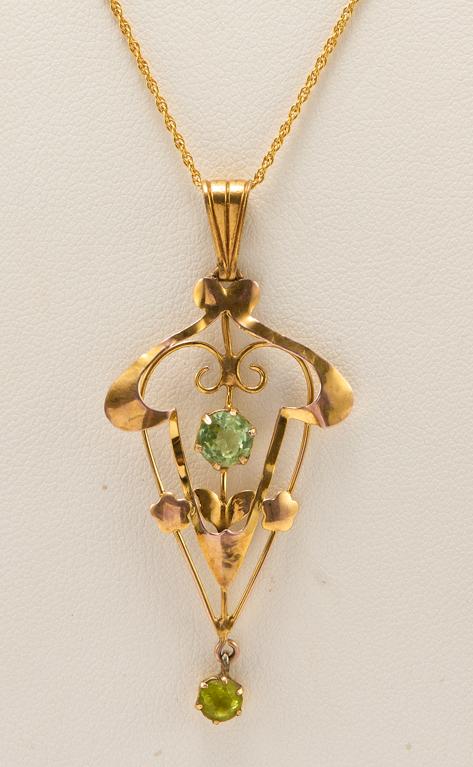 AN EDWARDIAN GREEN HARDSTONE SET PENDANT TO A FINE CHAIN IN 9CT GOLD, THE CHAIN APPOXIMATELY 440MM, THE PENDANT 50 X 25MM, 2.70GMS