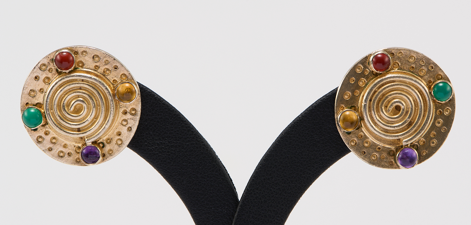 A PAIR OF ETRUSCAN REVIVAL STYLE GEM SET EARRINGS IN SILVER GILT, TO POST AND CLIP FITTINGS, 25MM DIAMETER
