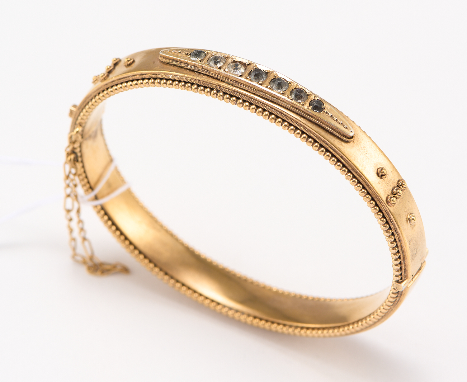 A VICTORIAN PASTE SET HINGED BANGLE IN GOLD LINED METAL, INNER DIAMETER 60MM