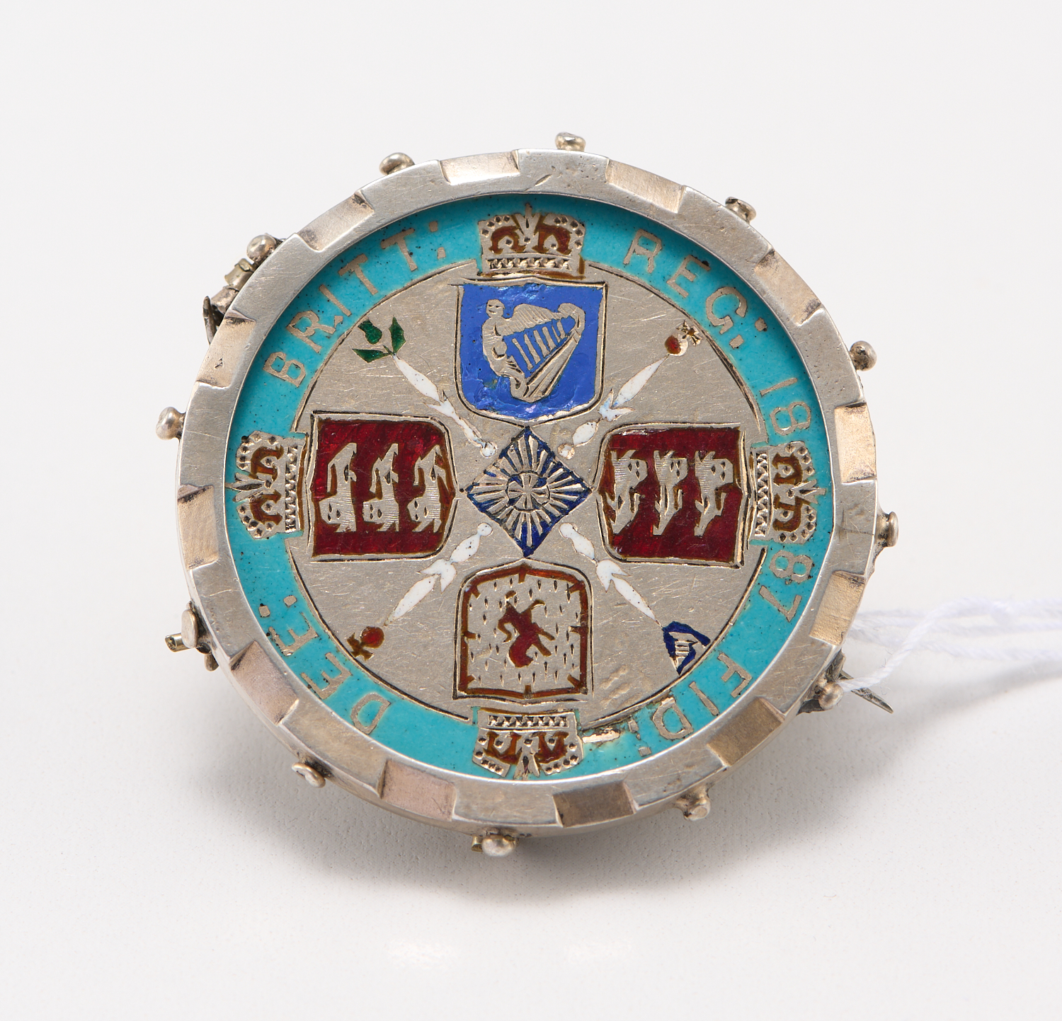 AN 1887 QUEEN VICTORIA JUBILEE HALF CROWN ENAMELLED COIN BROOCH, 40MM DIAMETER