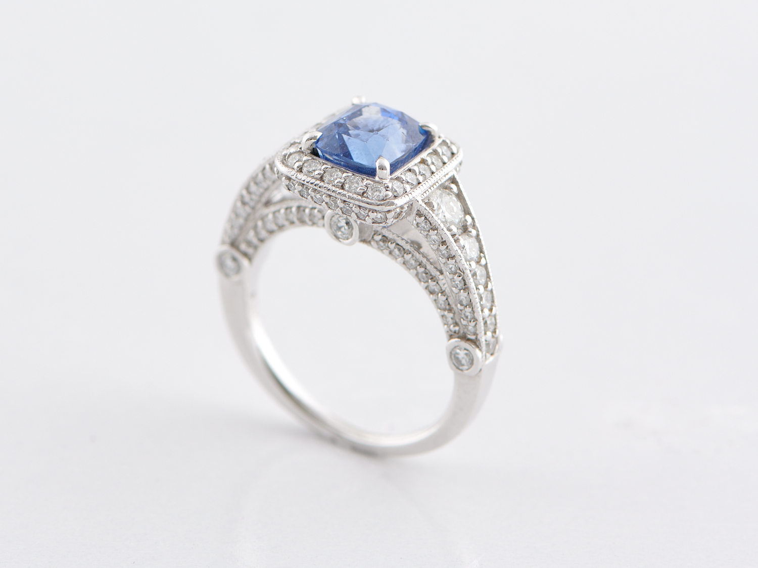 A SAPPHIRE AND DIAMOND CLUSTER RING IN 18CT WHITE GOLD, OF CLUSTER DESIGN, CENTRING A CLAW-SET OVAL-CUT SAPPHIRE WEIGHING APPROXIMAT...