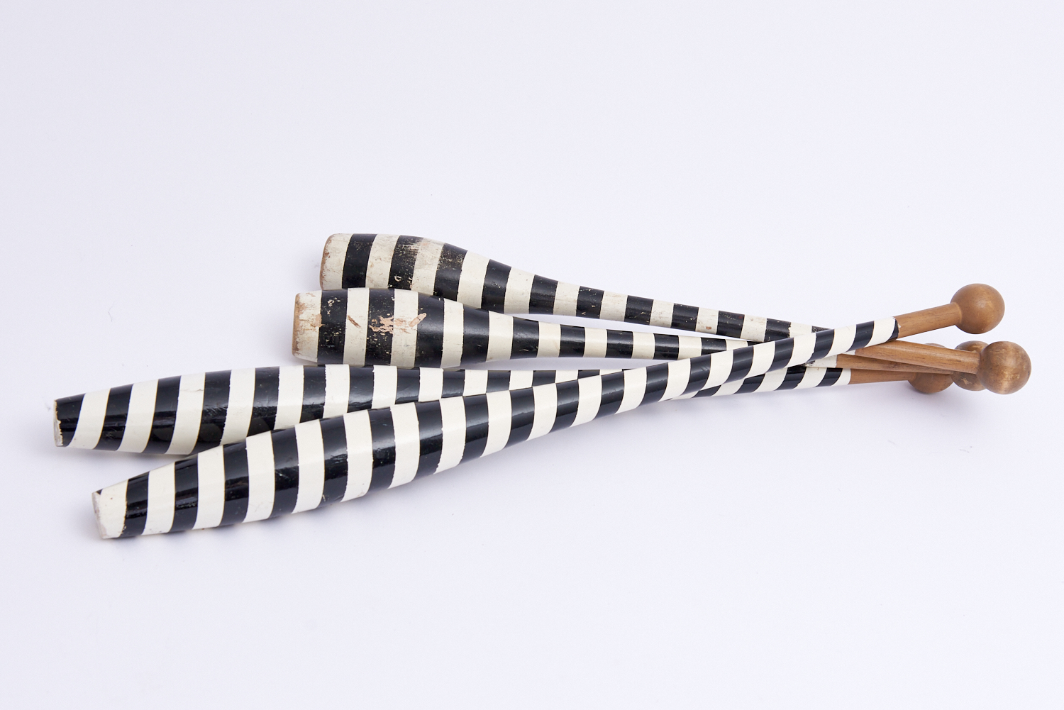 TWO PAIRS OF VINTAGE HAND PAINTED WOODEN JUGGLING BATONS, L.38CM, LEONARD JOEL LOCAL DELIVERY: SMALL