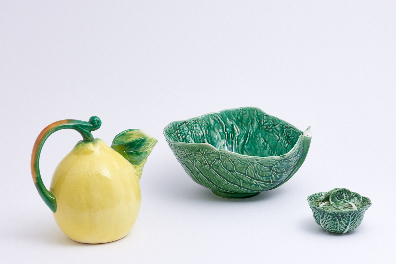 TWO VINTAGE PORTUGUESE FRUIT AND VEGETABLE FORM BOWLS TOGETHER WITH A JUG, DIA.24CM, LEONARD JOEL LOCAL DELIVERY: MEDIUM