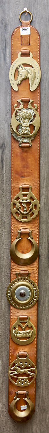 A HORSE BRASS DISPLAY ON LEATHER, L.108CM, LEONARD JOEL LOCAL DELIVERY: SMALL