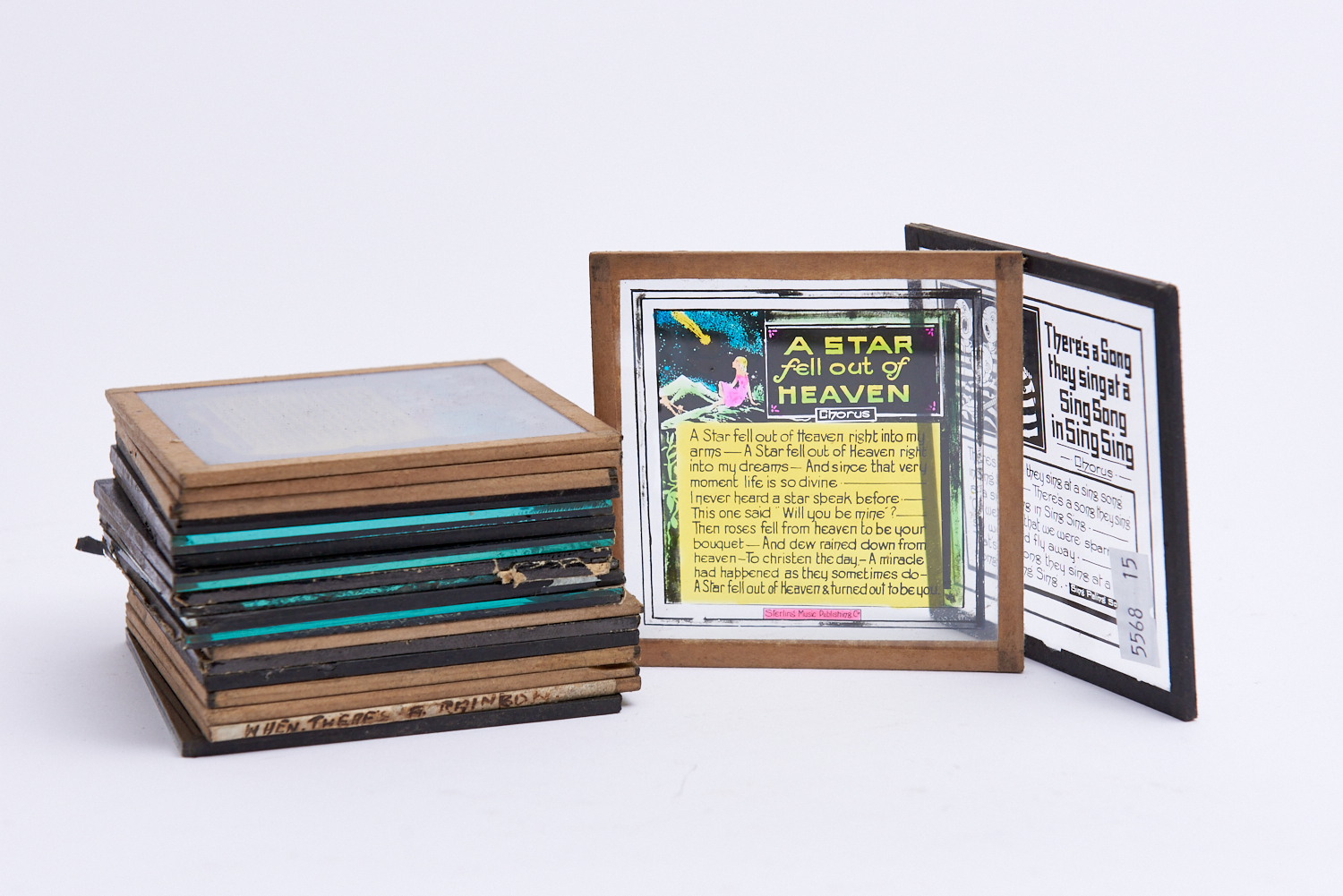 A COLLECTION OF VINTAGE COLOURED GLASS ADVERTISING SLIDES INCLUDING SNOW WHITE AND A STAR FELL OUT OF HEAVEN, W.8.5CM, LEONARD JOEL LOCAL DELIVERY: SMALL