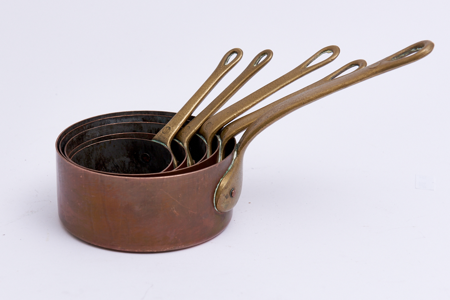 A GRADUATED SET OF FIVE SMALL COPPER SAUCEPANS WITH BRASS HANDLES, DIA.10CM, LEONARD JOEL LOCAL DELIVERY: SMALL