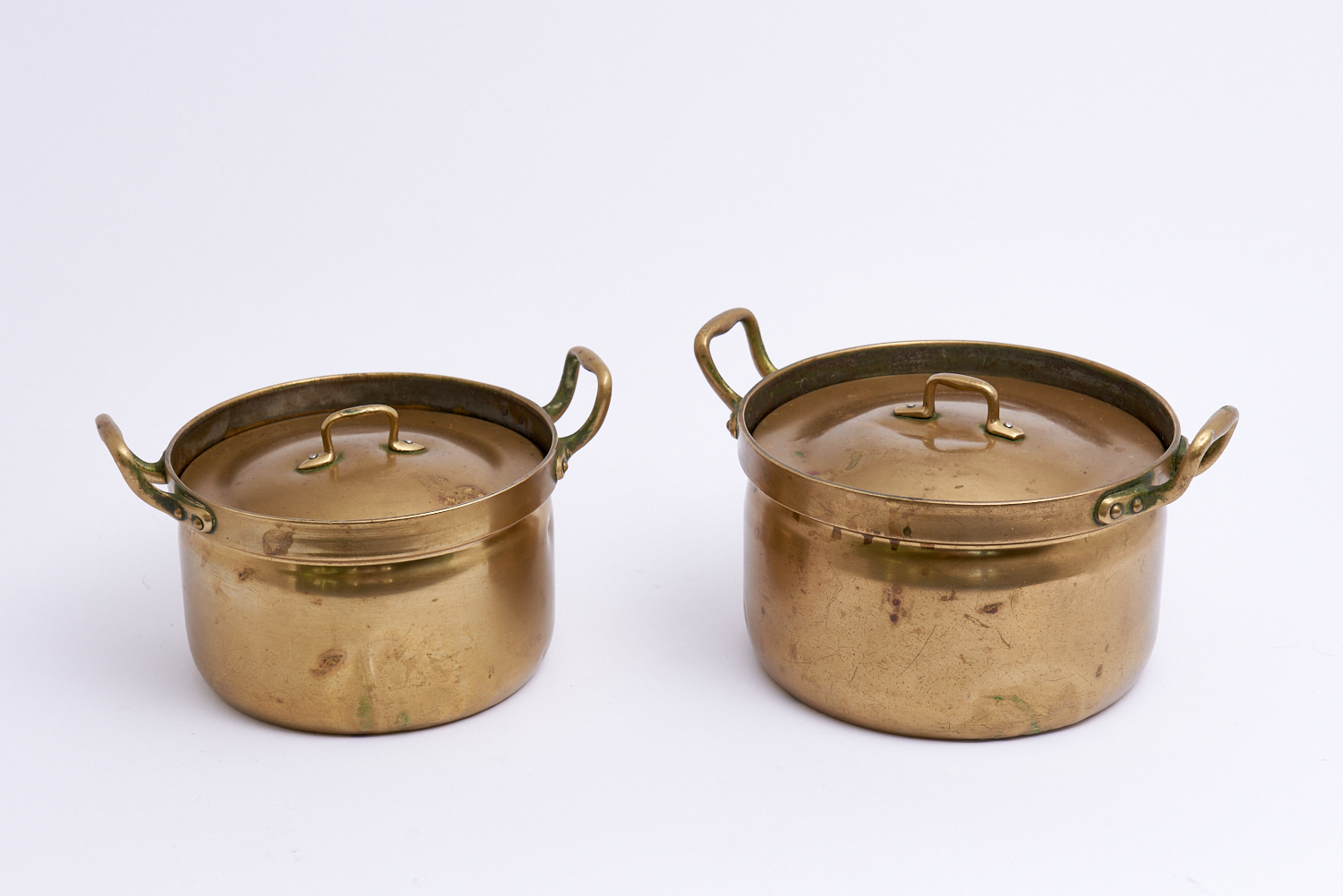 TWO LIDDED BRASS SAUCEPANS, W.24CM, LEONARD JOEL LOCAL DELIVERY: MEDIUM