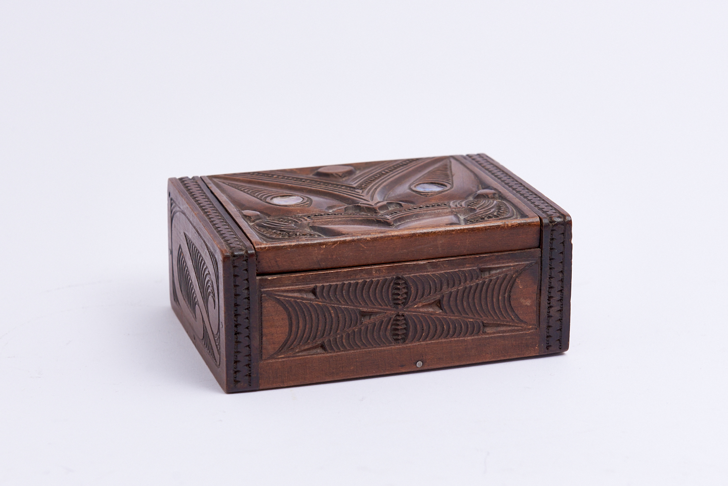 A VINTAGE MAORI CARVED WOODEN BOX, H.5.5 X W.13.5 X D.9.5CM, LEONARD JOEL LOCAL DELIVERY: SMALL