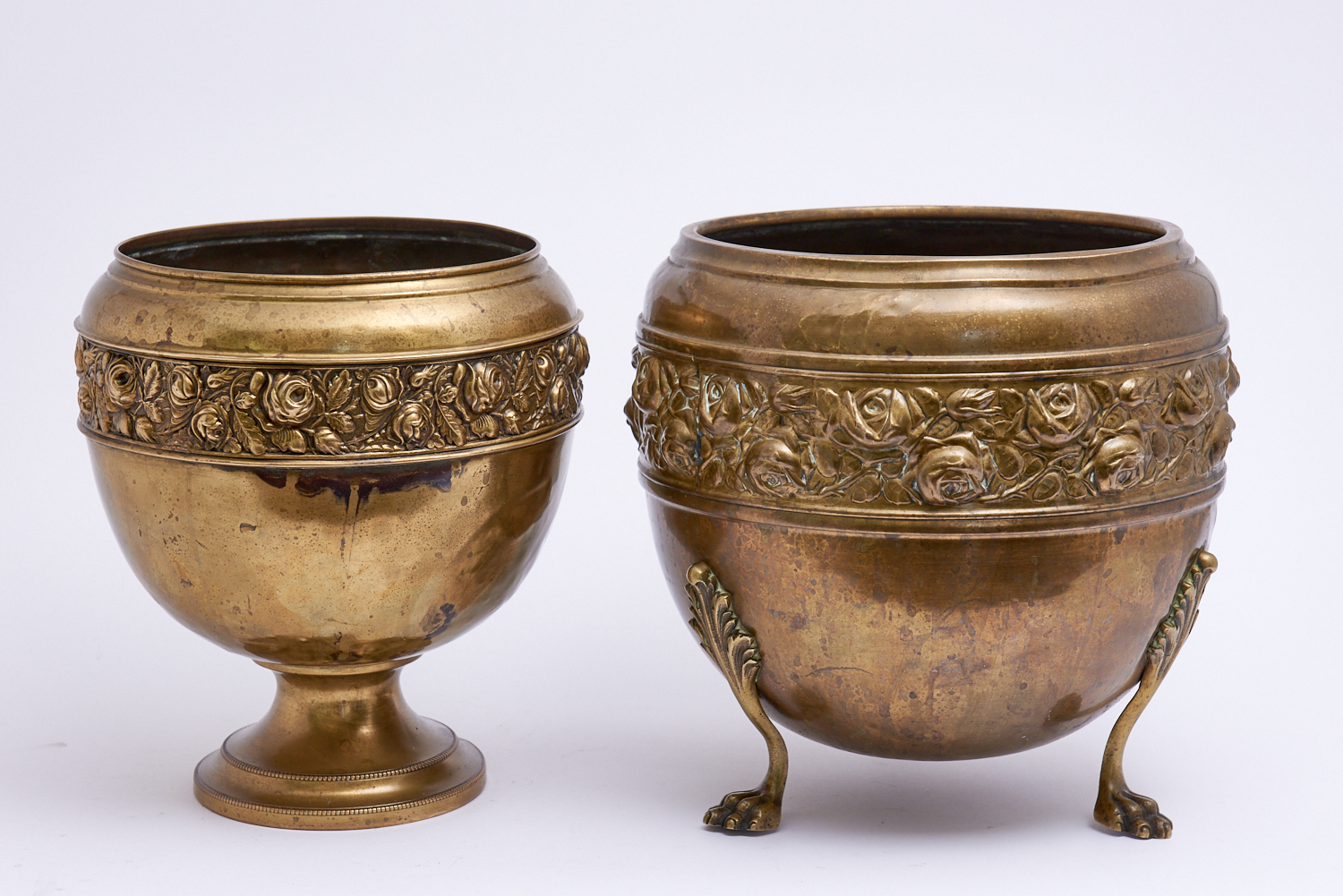 TWO BRASS PLANTER POTS BOTH WITH CENTRAL RAISED ROSE DECORATION, H.27CM, LEONARD JOEL LOCAL DELIVERY: MEDIUM