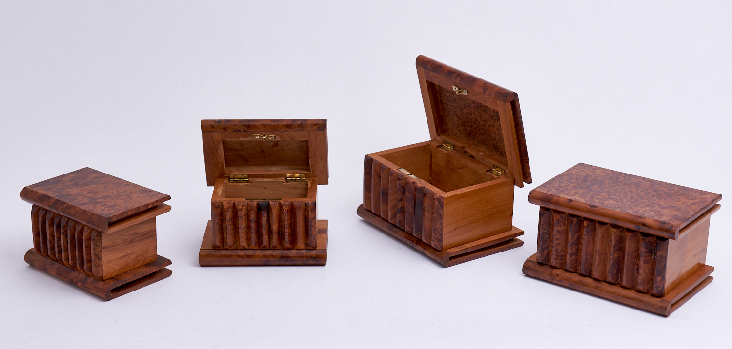 FOUR WOODEN BOOK FORM MYSTERY BOXES, H.10 X W.16 X D.11CM, LEONARD JOEL LOCAL DELIVERY: SMALL