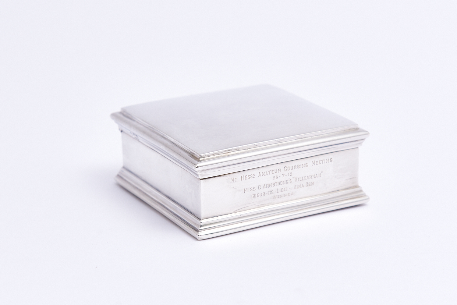 A STERLING SILVER HALLMARKED HINGE LIDDED BOX WITH PURPLE VELVET LINING H.3.5CM X W.9CM X D.8.5CM, LEONARD JOEL LOCAL DELIVERY: SMALL