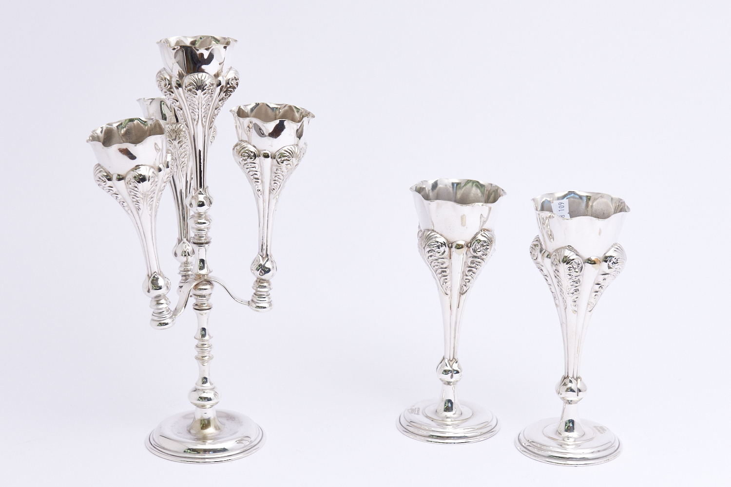 A THREE PIECE SILVER PLATED EPERGNE GARNIATURE H.31CM, LEONARD JOEL LOCAL DELIVERY: SMALL