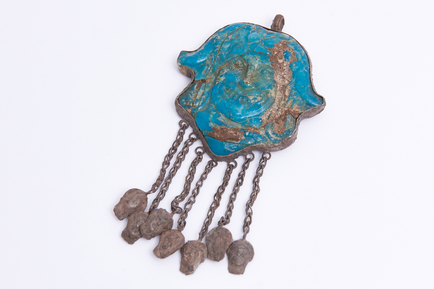 A TURQUOISE GLASS AMULET WITH FIGURAL HEAD H.15.5CM, LEONARD JOEL LOCAL DELIVERY: SMALL