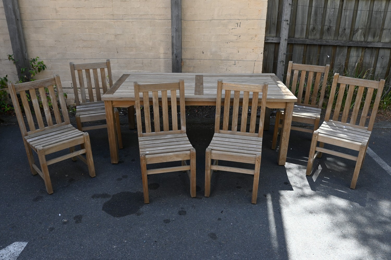 A SEVEN PIECE JATI OUTDOOR SETTING (A/F) (74H X 183W X 101D CM) (PLEASE NOTE THIS HEAVY ITEM MUST BE REMOVED BY CARRIERS AT THE CUSTOMER'S EXPENSE. LEONARD JOEL STAFF CANNOT ASSIST CARRYING THIS ITEM) (X-LARGE ITEM)