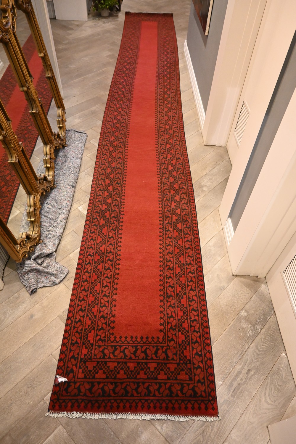 AN AFGHAN TURKOMAN RUNNER, 100% WOOL IN DEEP POMMEGRANITE TONES (588 X 82 CM) (LEONARD JOEL DELIVERY SIZE: LARGE)