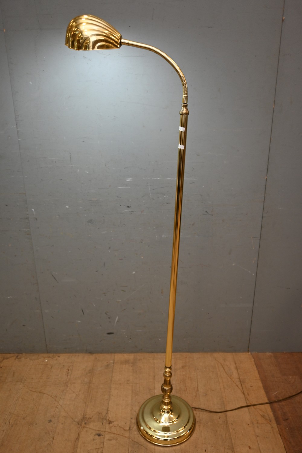 A BRASS STANDARD LAMP WITH SHELL HEAD ON GOOSE NECK (159H CM) (LEONARD JOEL DELIVERY SIZE: LARGE)