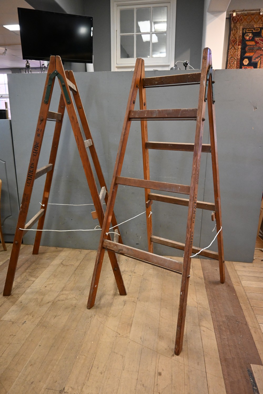 A PAIR OF VINTAGE KENNETT LADDERS (A/F) (208H X 90W X 115D CM) (LEONARD JOEL DELIVERY SIZE: X-LARGE)
