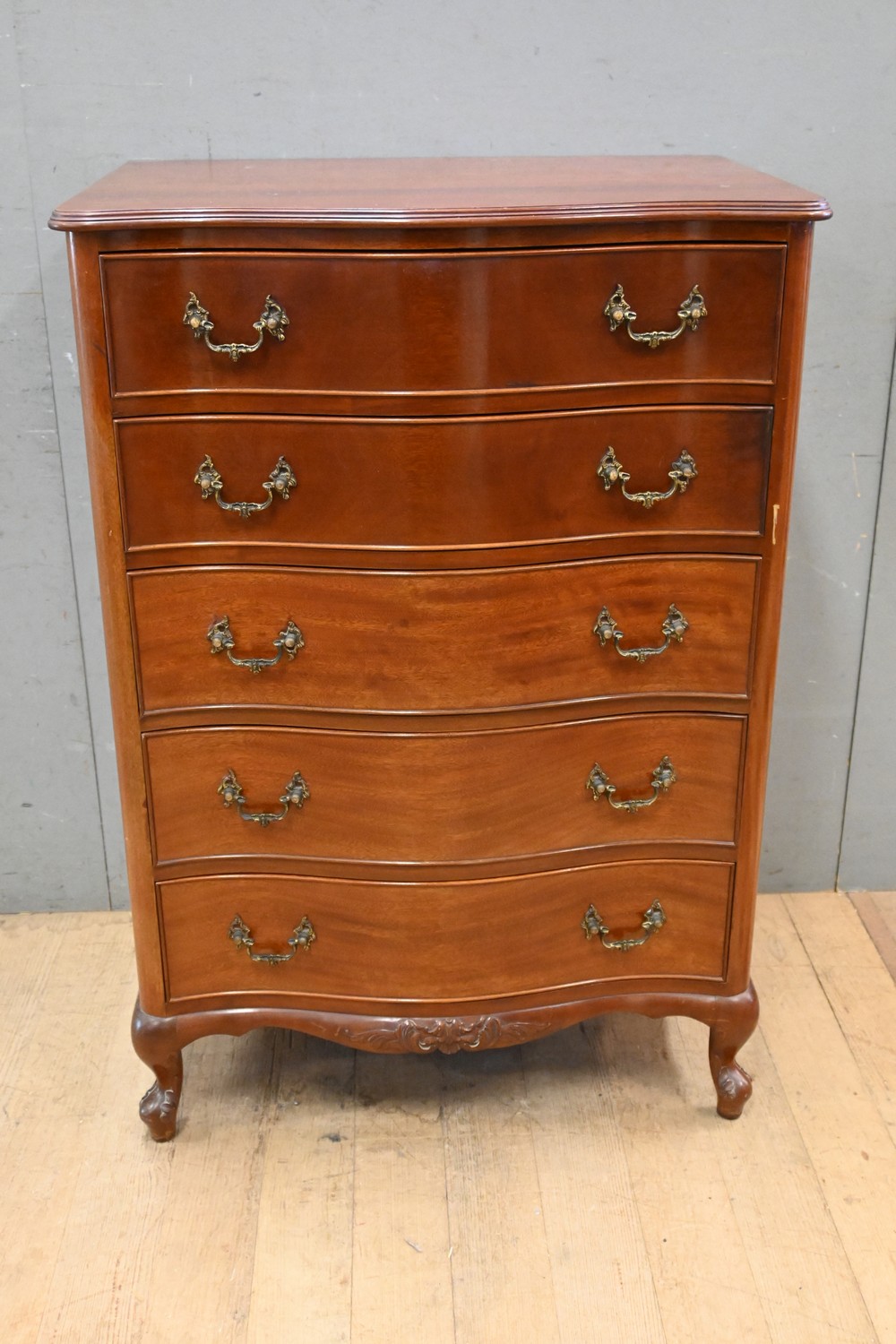 A SERPENTINE FRONT FIVE DRAWER CHEST (A/F) (108H X 75W X 53D CM) (PLEASE NOTE THIS HEAVY ITEM MUST BE REMOVED BY CARRIERS AT THE CUSTOMER'S EXPENSE. LEONARD JOEL STAFF CANNOT ASSIST CARRYING THIS ITEM) (X-LARGE ITEM)