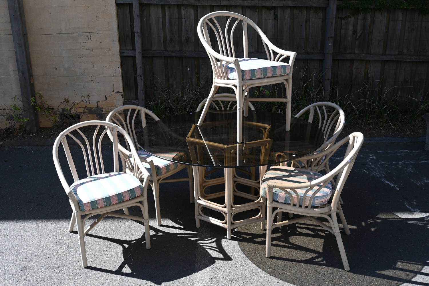 A GARRY MASTERS CIRCULAR SMOKED GLASS TABLE WITH SIX CHAIRS, ALL SIGNED (75H X 137D CM) (LEONARD JOEL DELIVERY SIZE: X-LARGE)