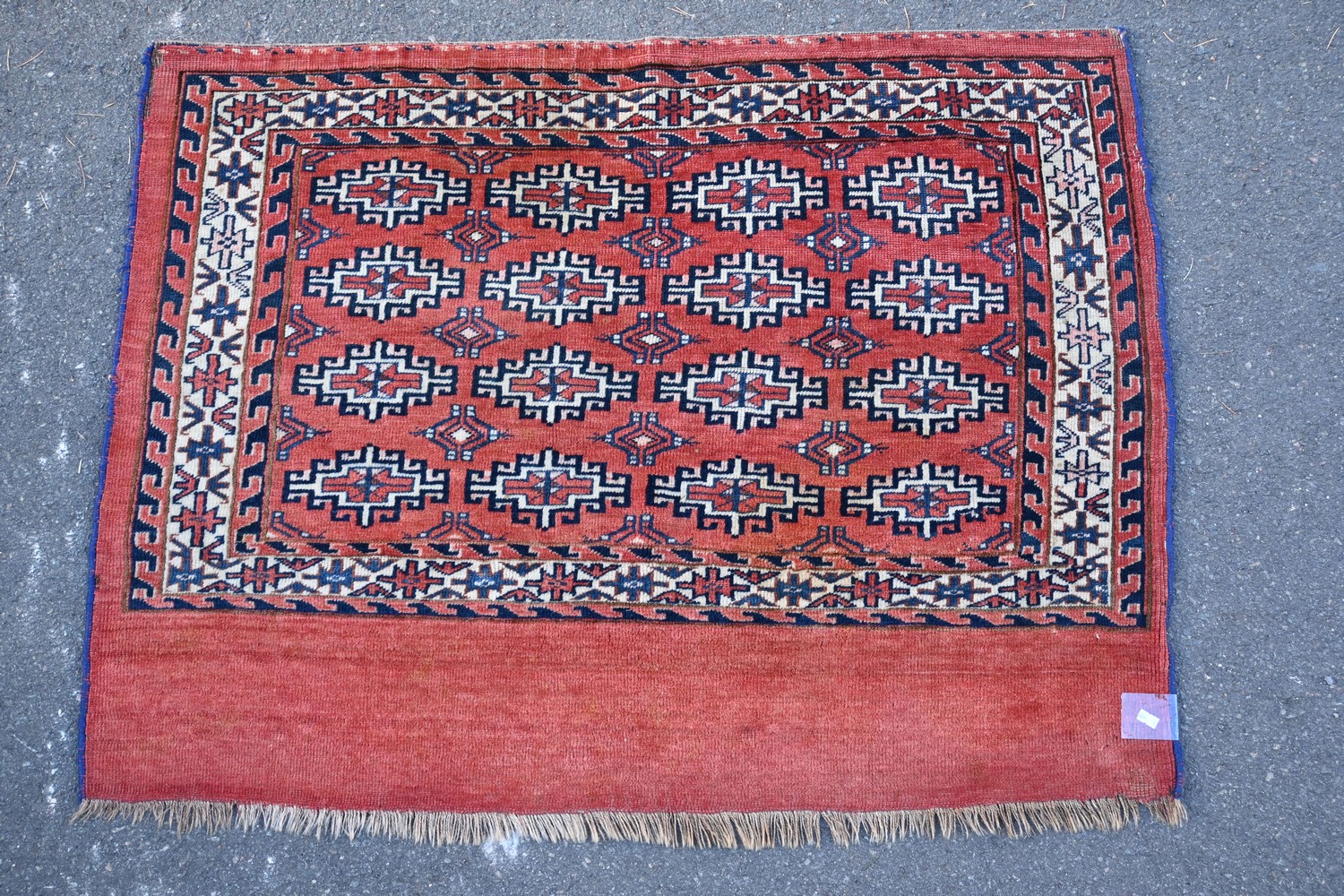 A KAZAKSTANI HERALDIC RUG WITH CENTRAL MEDALLION ON A RED FIELD (A/F) ( 117 X 92 CM) (LEONARD JOEL DELIVERY SIZE: MEDIUM)