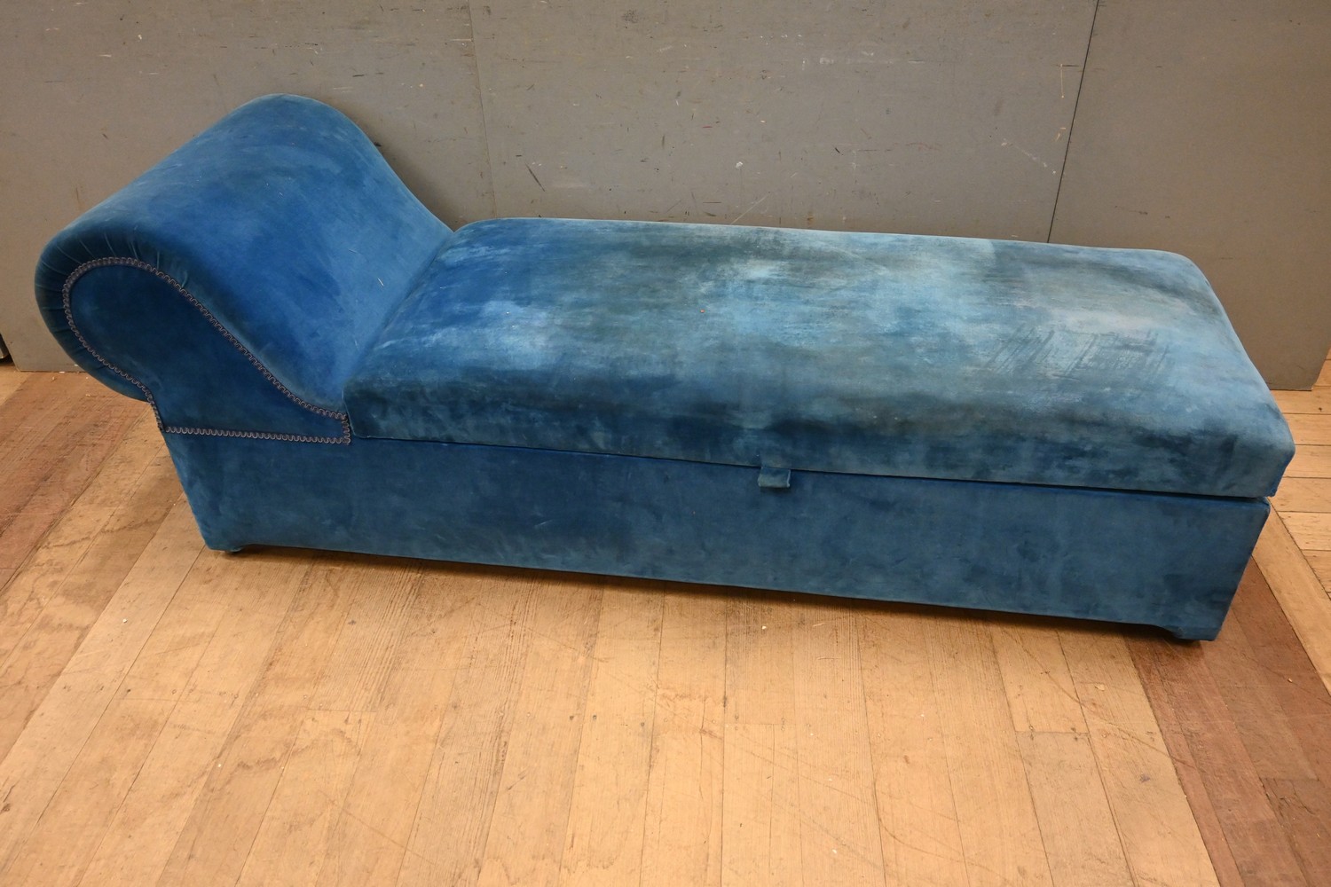 A BLUE UPHOLSTERED CHAISE LOUNGE (A/F) (65H X 190W X 60D CM) (LEONARD JOEL DELIVERY SIZE: X-LARGE)