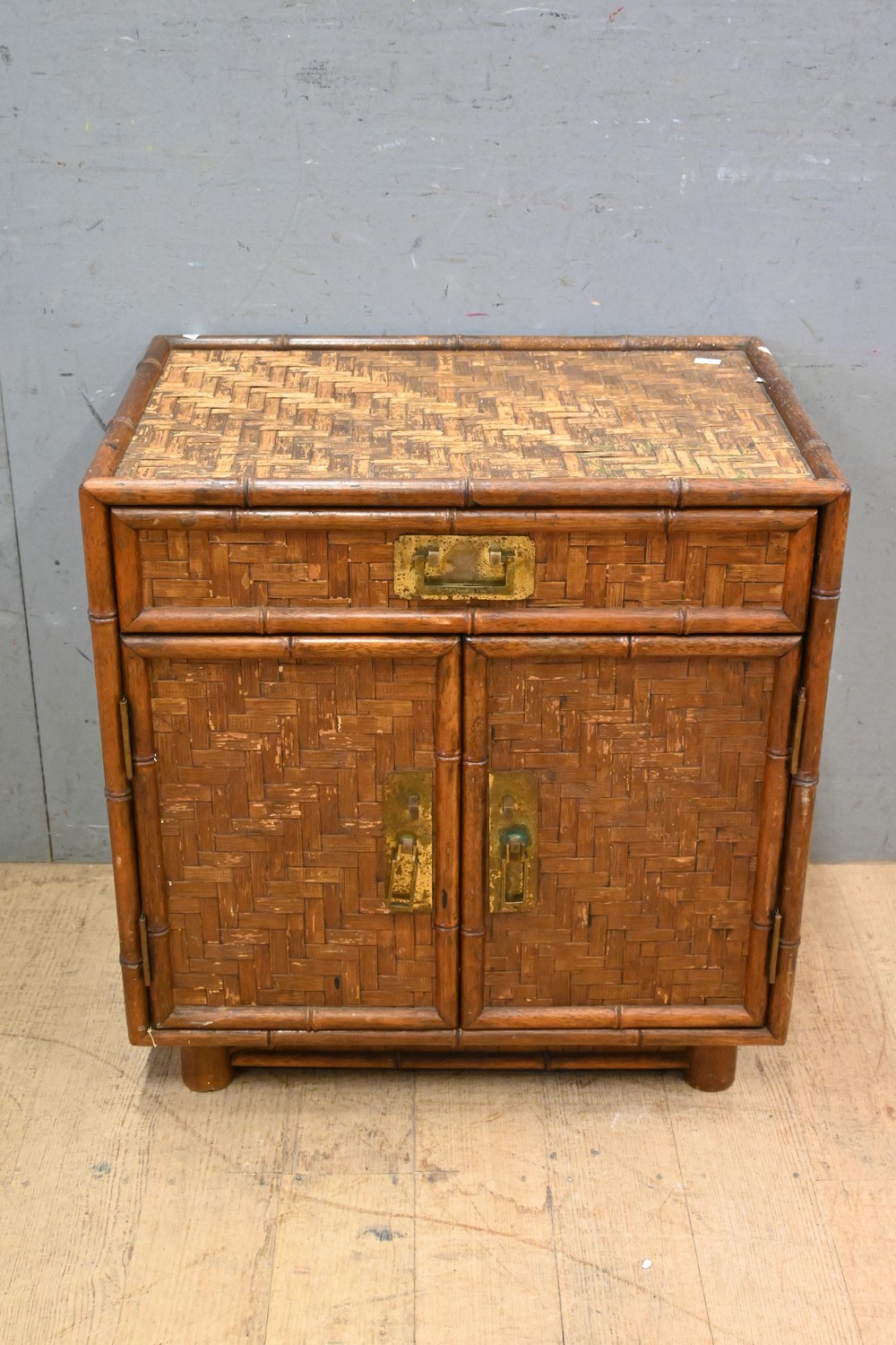 A BAMBOO AND WEAVE TWO DOOR BEDSIDE CABINET (A/F) (56H X 54W X 38D CM) (LEONARD JOEL DELIVERY SIZE: LARGE)
