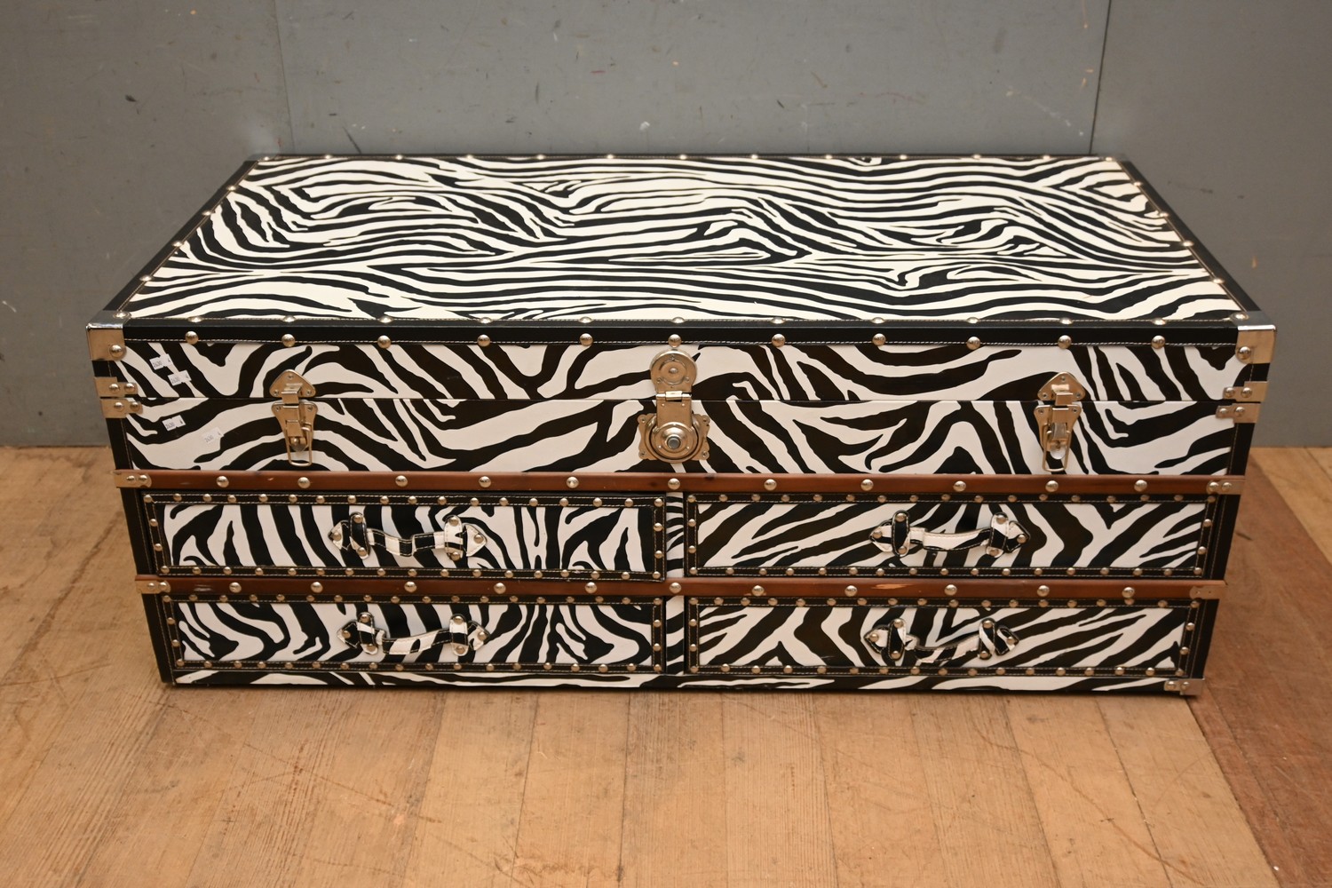 A ZEBRA PATTERNED FOUR DRAWER COFFEE TABLE WITH LIFT UP TOP (47H X 121W X 61D CM) (LEONARD JOEL DELIVERY SIZE: X-LARGE)