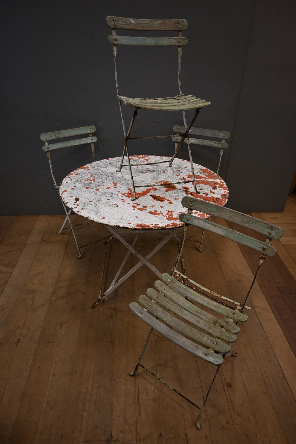 A FRENCH FIVE PIECE OUTDOOR SETTING (A/F) (69H X 100D CM) (LEONARD JOEL DELIVERY SIZE: X-LARGE)