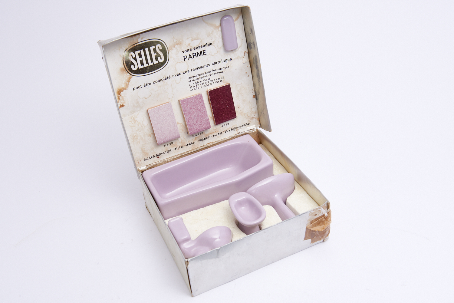 1960'S CERAMIC BATHROOM EXAMPLE SUITE IN ORIGINAL BOX W.18.5CM, LEONARD JOEL LOCAL DELIVERY: SMALL