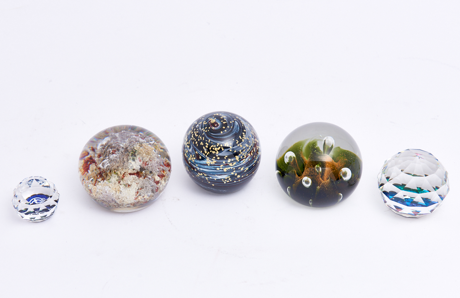COLLECTION OF FIVE MURANO GLASS PAPERWEIGHTS, ONE SIGNED, LEONARD JOEL LOCAL DELIVERY: SMALL