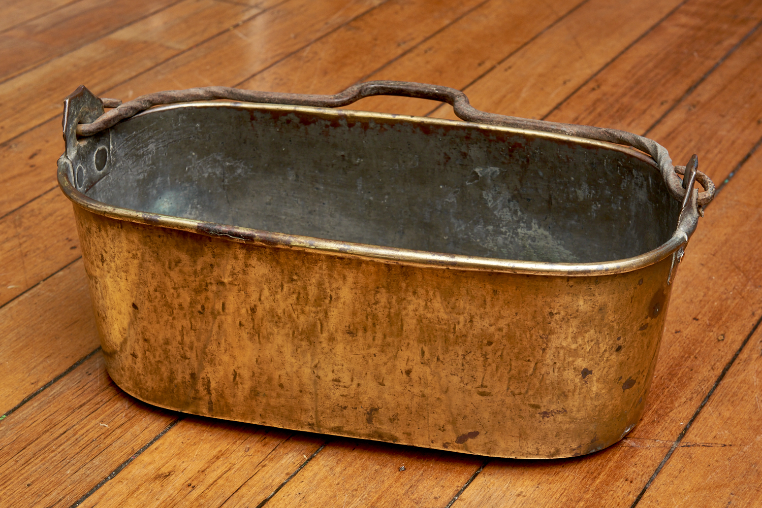 A BRASS FISH PAN WITH CAST IRON HANDLE W.48.5CM, LEONARD JOEL LOCAL DELIVERY: MEDIUM