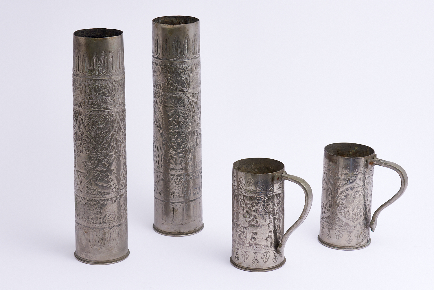 A GROUP OF WWII MILITARY TRENCH ART WITH EMBOSSED DECORATION H.34.5CM, LEONARD JOEL LOCAL DELIVERY: MEDIUM
