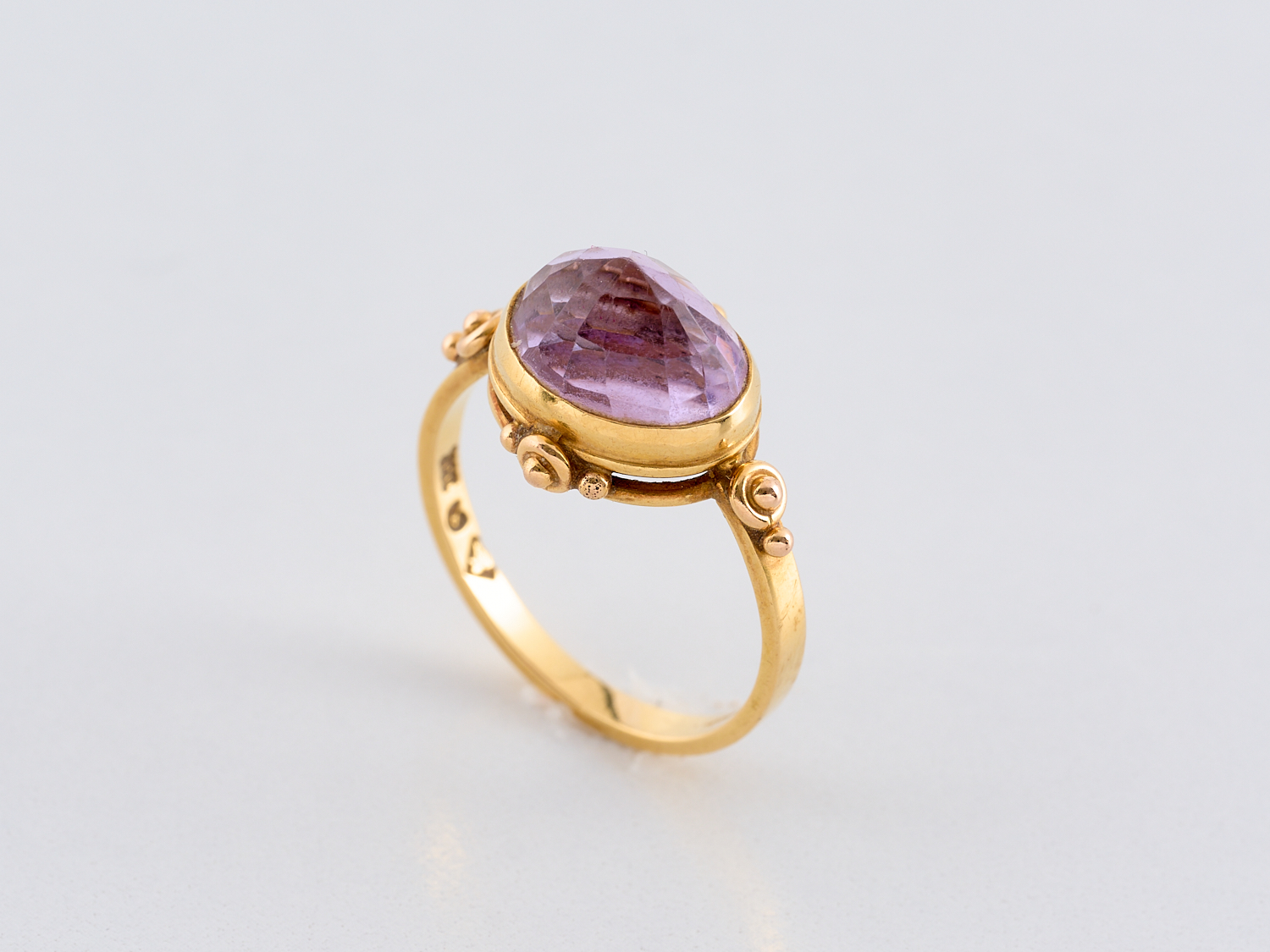 A VINTAGE ''UPSETTING THE STONE'' INVERTED BRIOLETTE CUT AMETHYST SET RING IN 18CT GOLD BY PHILL MASON, RING SIZE J, 3.4GMS