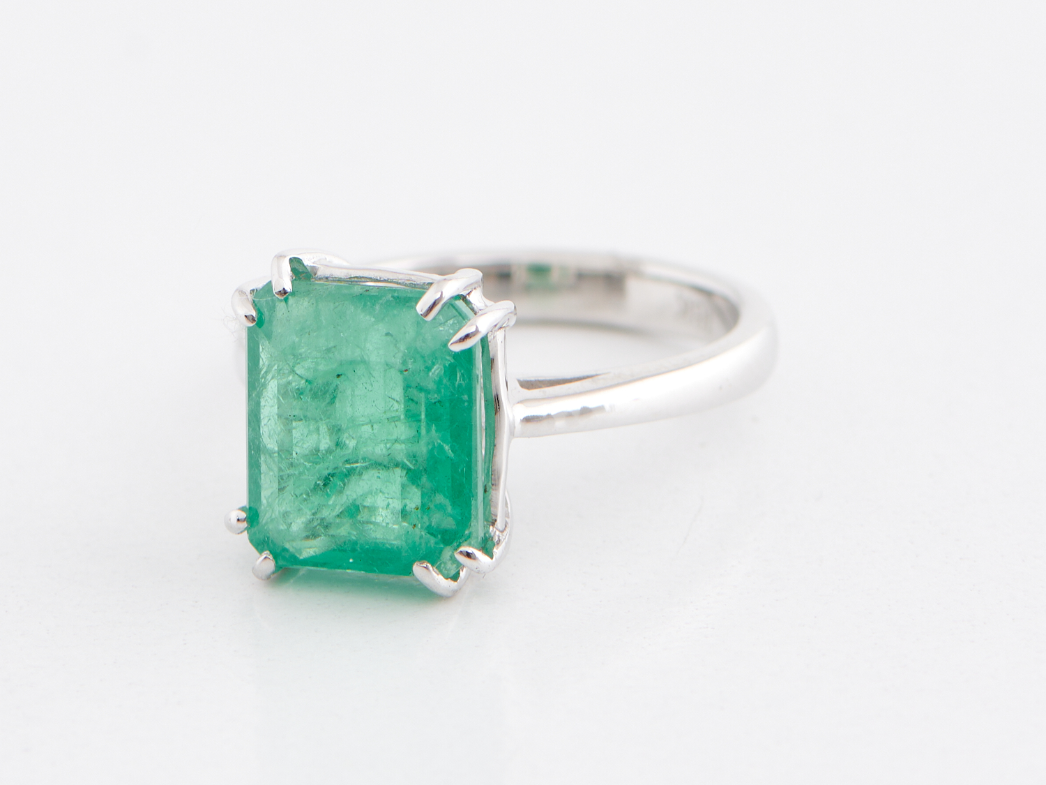 A ZAMBIAN EMERALD RING IN 18CT WHITE GOLD, THE EMERALD TOTALLING APPROXIMATELY 4.50CTS, RING SIZE K, WEIGHT 4.56GMS, WITH VALUATION