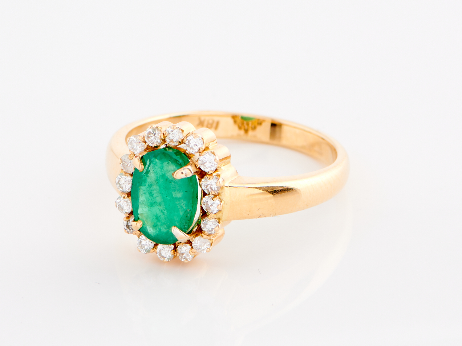 AN EMERALD A DIAMOND SET RING IN 18CT GOLD, THE EMERALD TOTALLING APPROXIMATELY 2.24CTS, THE DIAMONDS TOTALLING APPROXIMATELY 0.36CTS, RING SIZE T, WEIGHT 6.3GMS