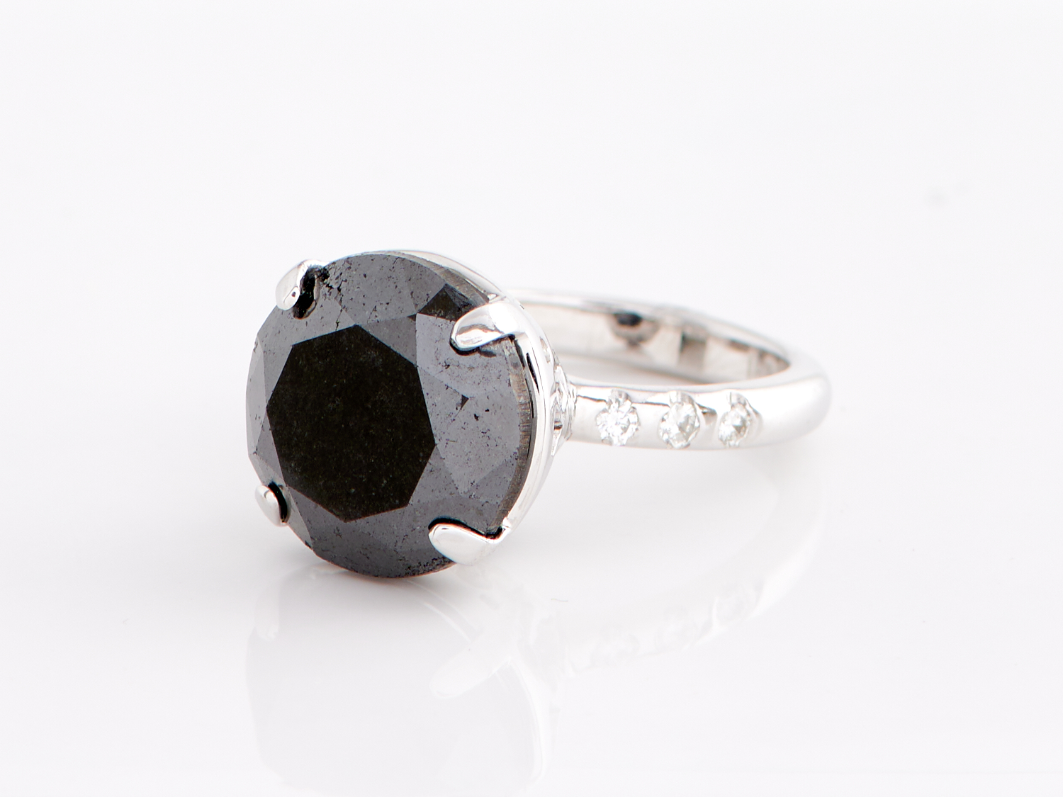 A BLACK DIAMOND AND DIAMOND SET RING IN 18CT WHITE GOLD, THE BLACK DIAMOND TOTALLING APPROXIMATELY 11.42CTS, THE DIAMONDS TOTALLING APPRXOIMATELY 0.22CTS, RING SIZE L, WEIGHT 8.13GMS, WITH VALUATION