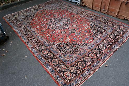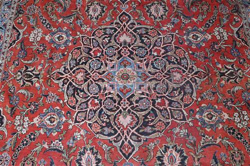 AN ANTIQUE BIDJAR CARPET WITH CENTRAL MEDALLION ON RED FIELD (A/F) (440 X 309 CM) (PLEASE NOTE THIS HEAVY ITEM MUST BE REMOVED BY CARRIERS AT THE CUSTOMER'S EXPENSE. LEONARD JOEL STAFF CANNOT ASSIST CARRYING THIS ITEM) (X-LARGE ITEM)