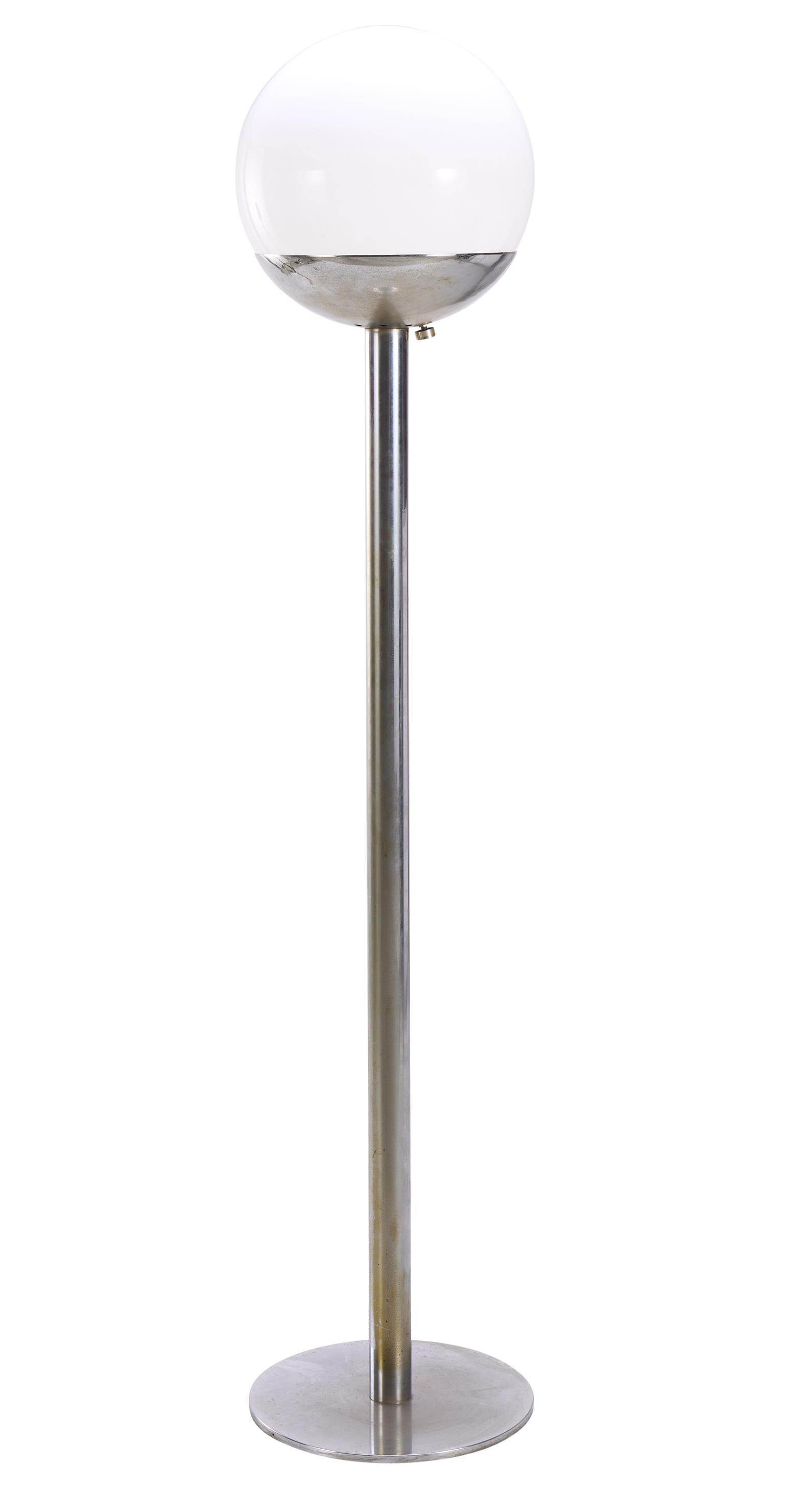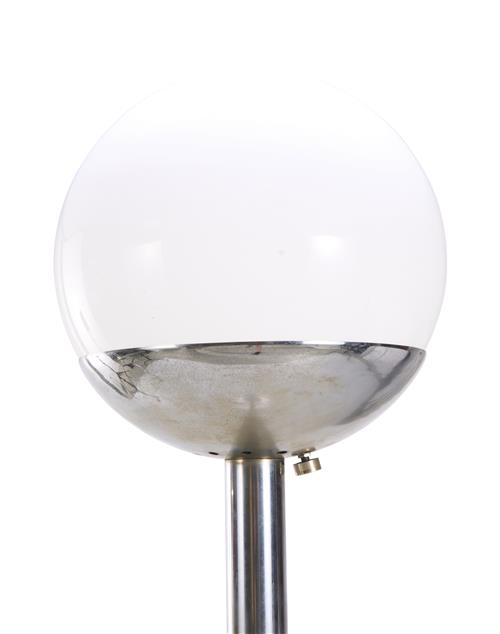 The lamp is composed of a large central stem in chrome-plated steel which starts from a large plate as a base. Below the large white glass sphere is a chrome-plated steel goblet. At the centre of the stem is the switch for switching the lamp on and off.