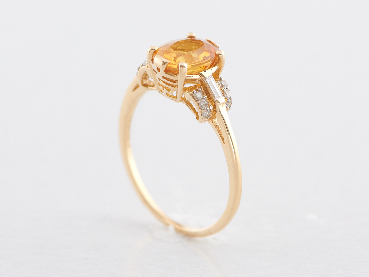 A YELLOW SAPPHIRE AND DIAMOND RING IN 14CT GOLD, THE SAPPHIRE TOTALLING 1.85CTS, THE DIAMONDS TOTALLING 0.08CTS, RING SIZE L