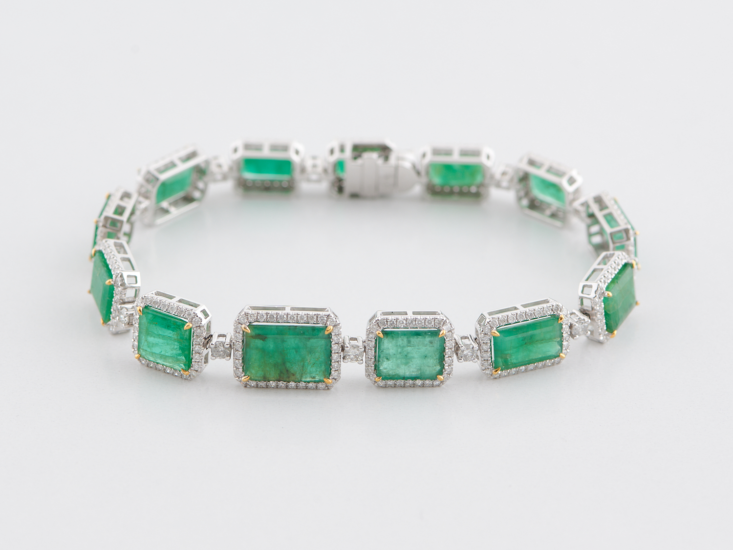 AN EMERALD AND DIAMOND LINE BRACELET IN 14CT WHITE GOLD, THE EMERALDS TOTALLING 16.62CTS, THE DIAMONDS TOTALLING 2.25CTS, 16.2GMS