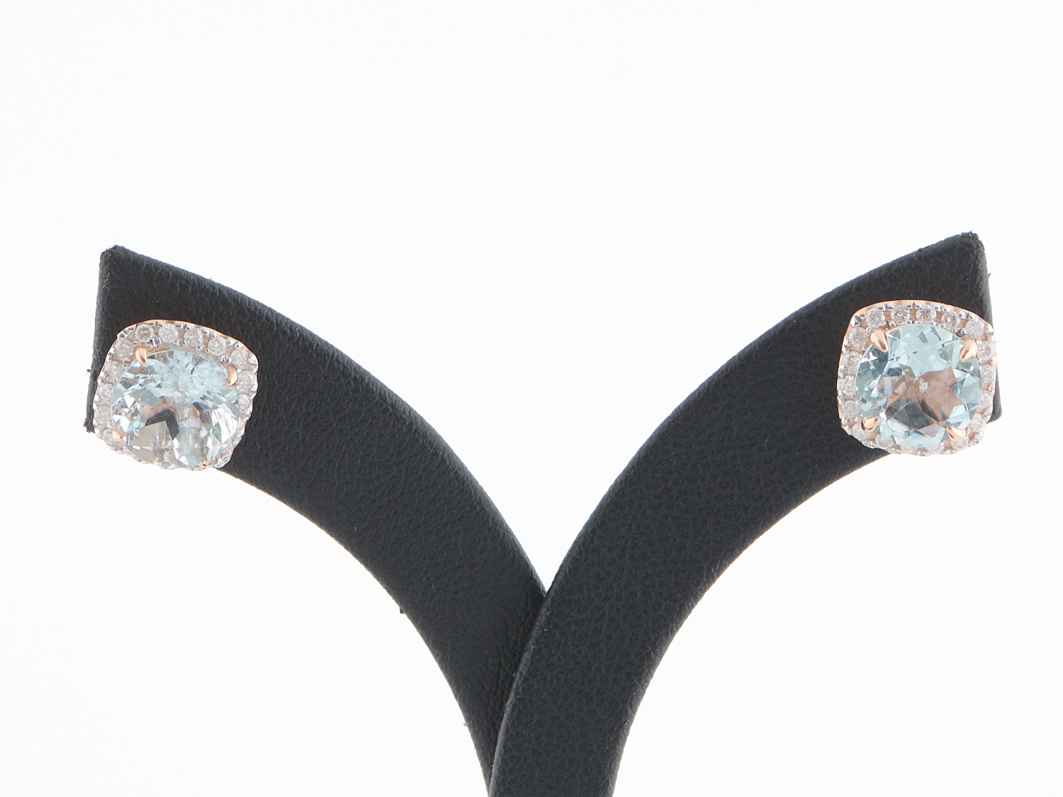 A PAIR OF AQUAMARINE AND DIAMOND STUDS IN 14CT ROSE GOLD, TO POST AND BUTTERFLY FITTINGS, THE AQUAMARINES TOTALLING 2.82CTS, THE DIAMOND TOTALLING 0.28CTS