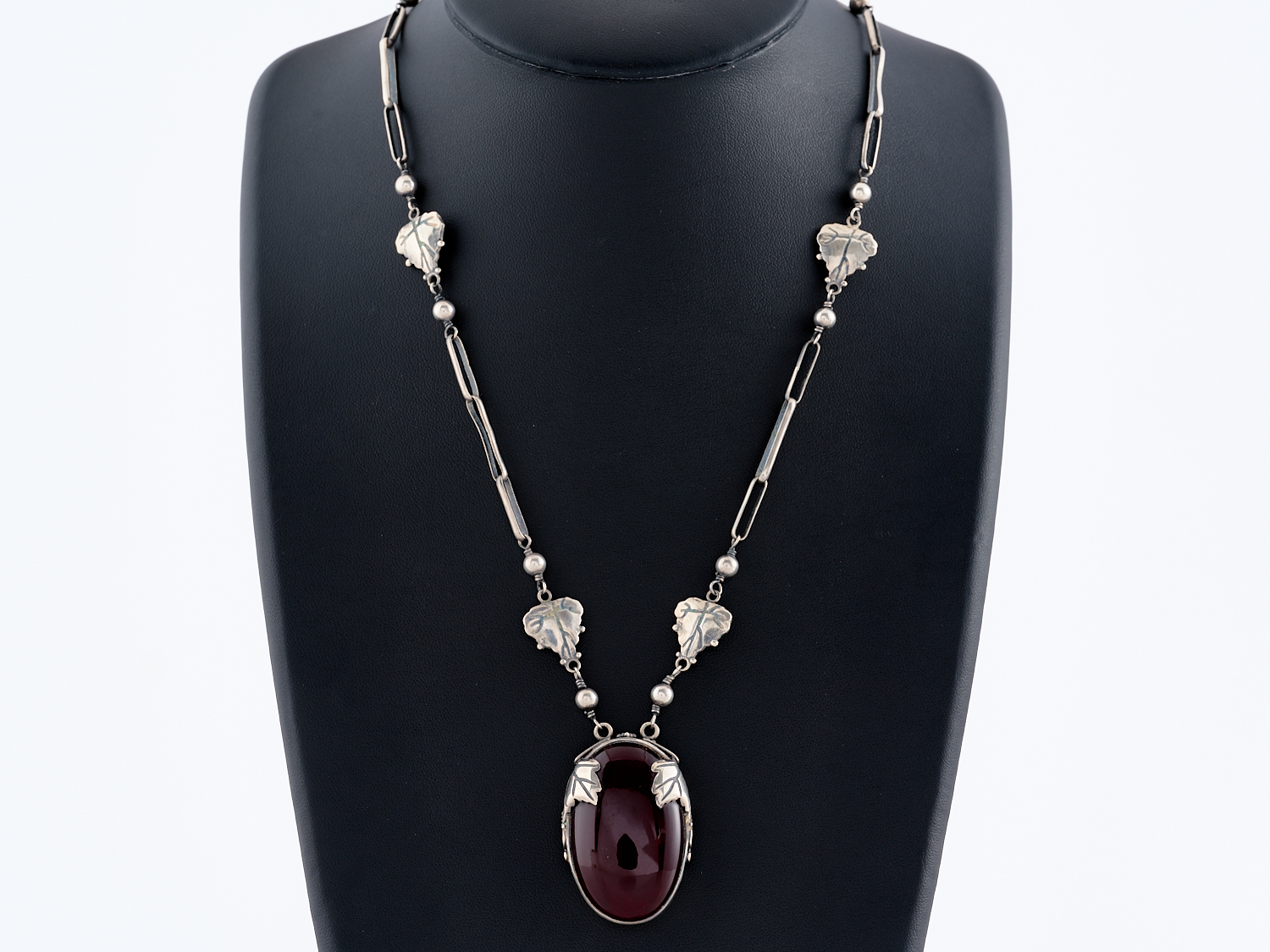 A GLASS AND STERLING SILVER PENDANT NECKLACE, LENGTH 460MM, RETAILED BY THE METROPOLITAN MUSEUM OF ART, BOXED